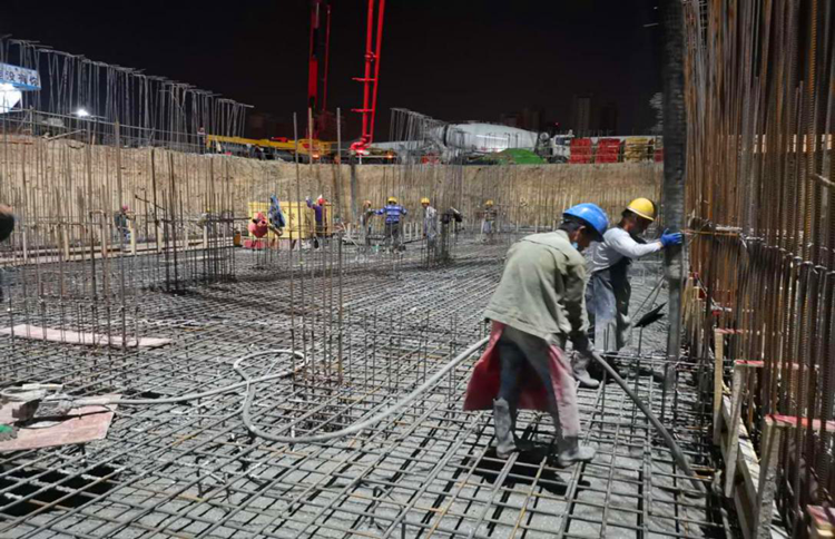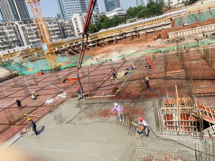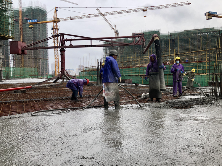 “五一”假期期間,一公司五省八地各項目搶抓黃金施工期,加大機械、人員投入力度,在保證工程質(zhì)量的前提下,加快施工進度。圖為一公司北海吾悅廣場項目五一期間澆筑混凝土。