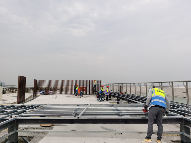 受新冠疫情影響,裝飾公司各項目復(fù)工節(jié)點比計劃稍有滯后,為了追回進度,五一小假期間,各在建項目不停工,管理人員依然堅守崗位,加班加點利用晴好天氣搶回工期。圖為裝飾公司安徽創(chuàng)新館2號館觀景平臺施工。