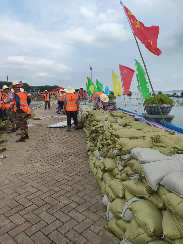 在連續(xù)奮戰(zhàn)三天后,合肥雨勢暫歇。然而未及休整,23日早7:30分,公司接到合肥市包河區(qū)相關單位緊急通知,前往環(huán)湖北路十五里河橋以東200米處搶險。公司立即組織行動,組織協(xié)調一分公司、三分公司、六分公司共計約120人,順利搶筑堤壩150米。