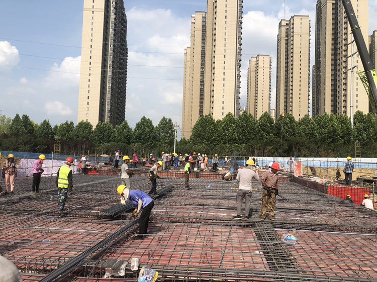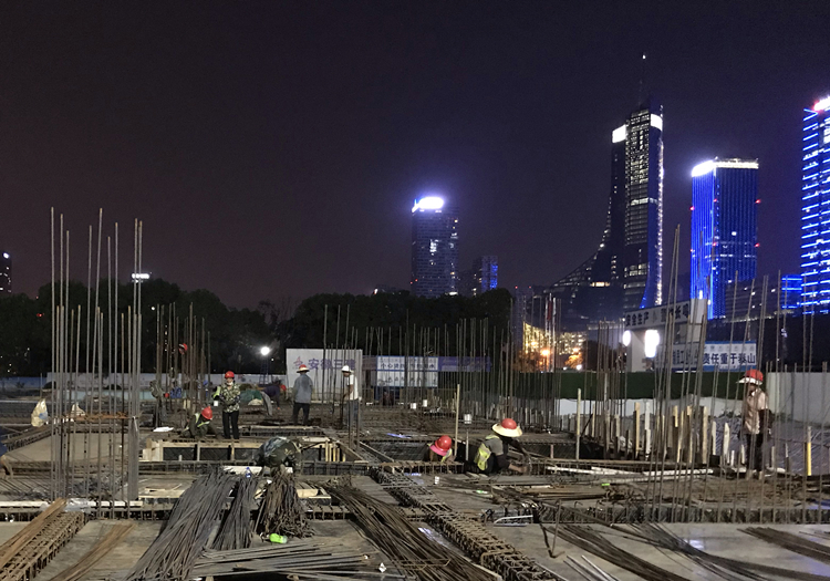 合肥市中心圖書館項目是合肥市重點工程,為保證施工進度,項目部不僅備好涼白開、礦泉水、綠豆湯、還有仁丹等解暑物品,錯開上午10點至下午3點白天高溫時間段進行施工,還將農民工學校教室及會議室空調全天開啟,以備工人休息使用。圖中是在華燈初上的天鵝湖畔,廣大工人師傅正在進行地庫鋼筋綁扎及外架搭設工作。