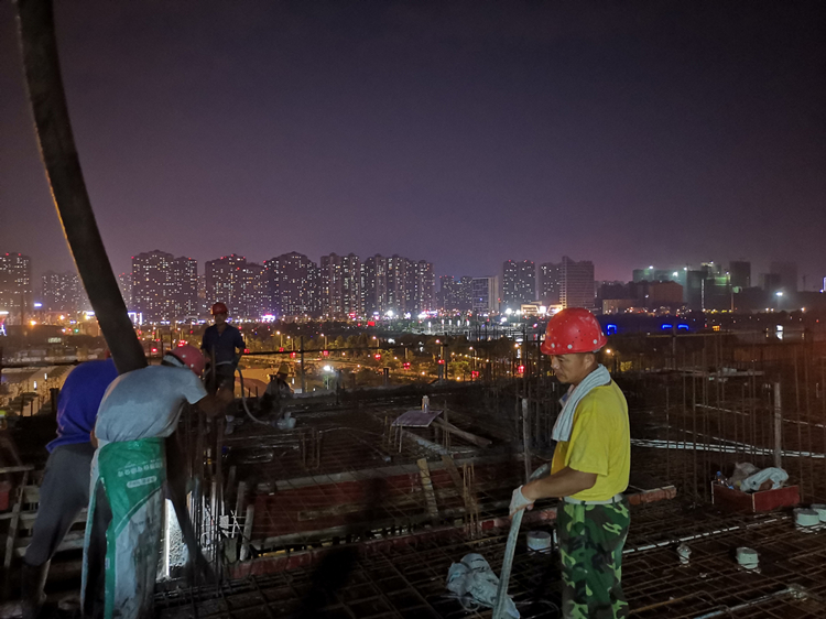 為避免日間高溫作業,六公司亳州三巽公園里項目合理調整作業時間,組織工人夜間施工,圖為8月4日夜間項目澆筑混凝土