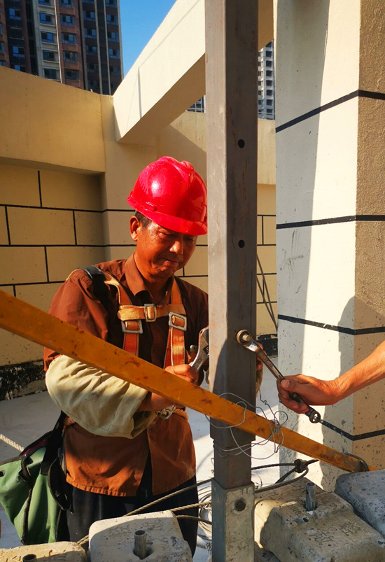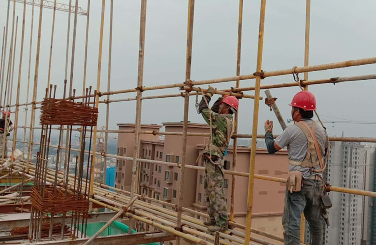 8月份以來,皖北連天35°以上高溫天氣,亳州時代樾府項目正值上結構階段,架業公司要求外架搭設班組嚴格遵守上級主管部門和項目部要求,錯峰上班、合理安排工作,既要搶抓工期,也要遵守安全搭設紀律,確保高溫期間施工安全。圖為工人師傅在搭設防護架。