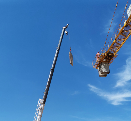 設備租賃公司吳金國等派駐六安一中項目班組冒著炎熱高溫,熱浪滾滾天氣,揮汗如雨,上衣汗透,堅持把十多臺塔吊裝好